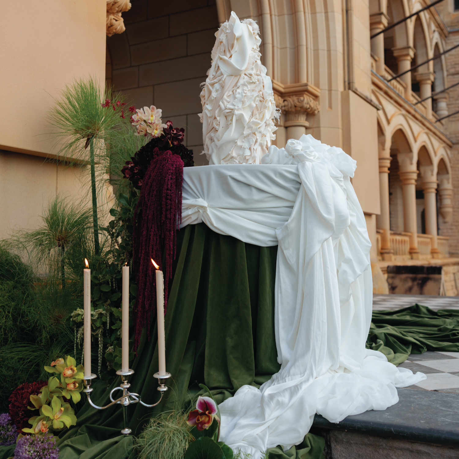 Sweeping drapery, opulent florals, and vintage silverware came together at Manly Castle to reimagine timeless romance with a contemporary edge. This editorial celebrates the art of draping layered with thoughtful details that transform atmosphere into experience.