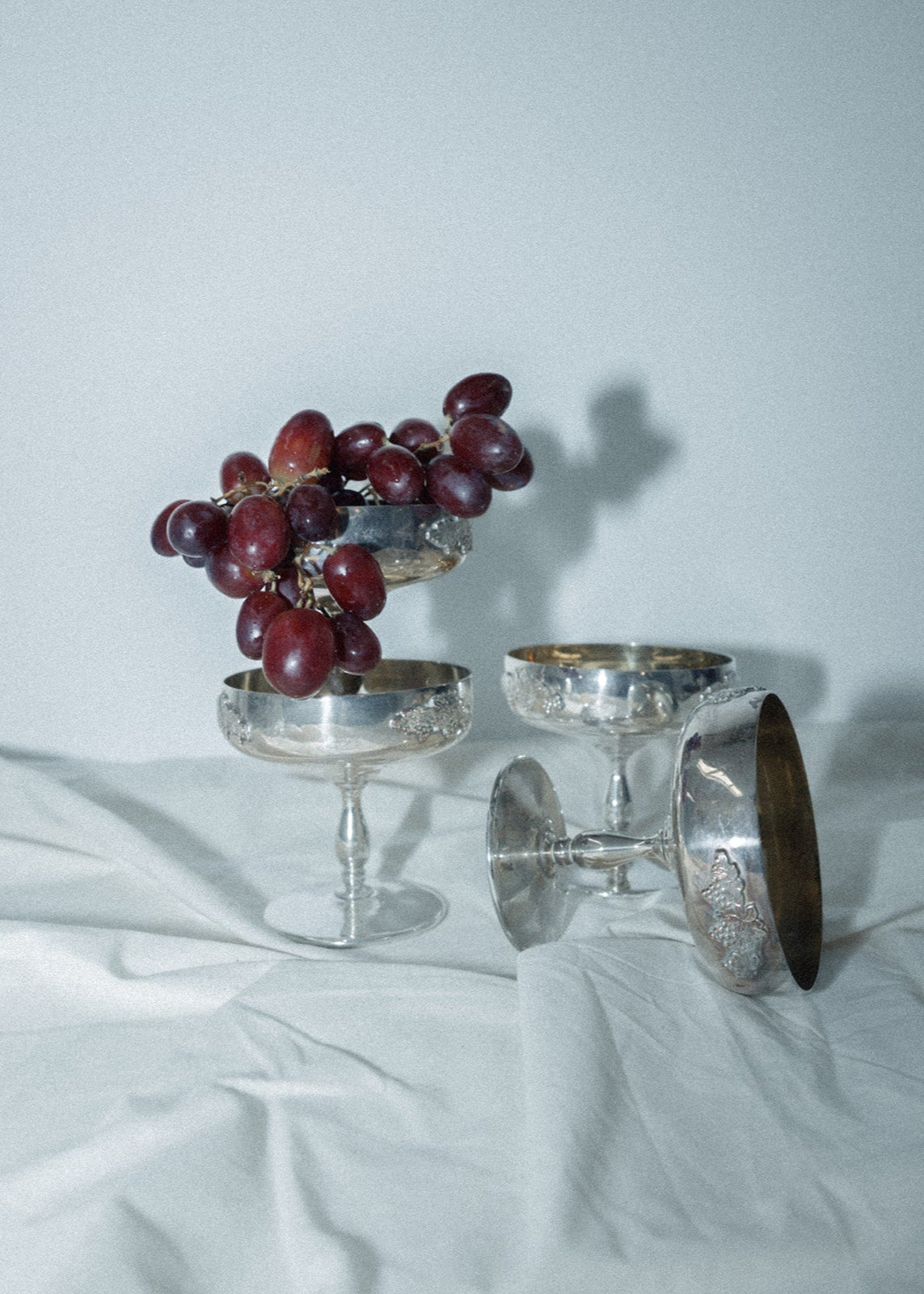 A set of silver coupe goblets, adorned with delicate embossed detailing. Perfect for serving champagne, desserts, or fruits with vintage elegance, equally striking styled together or as individual statement pieces.