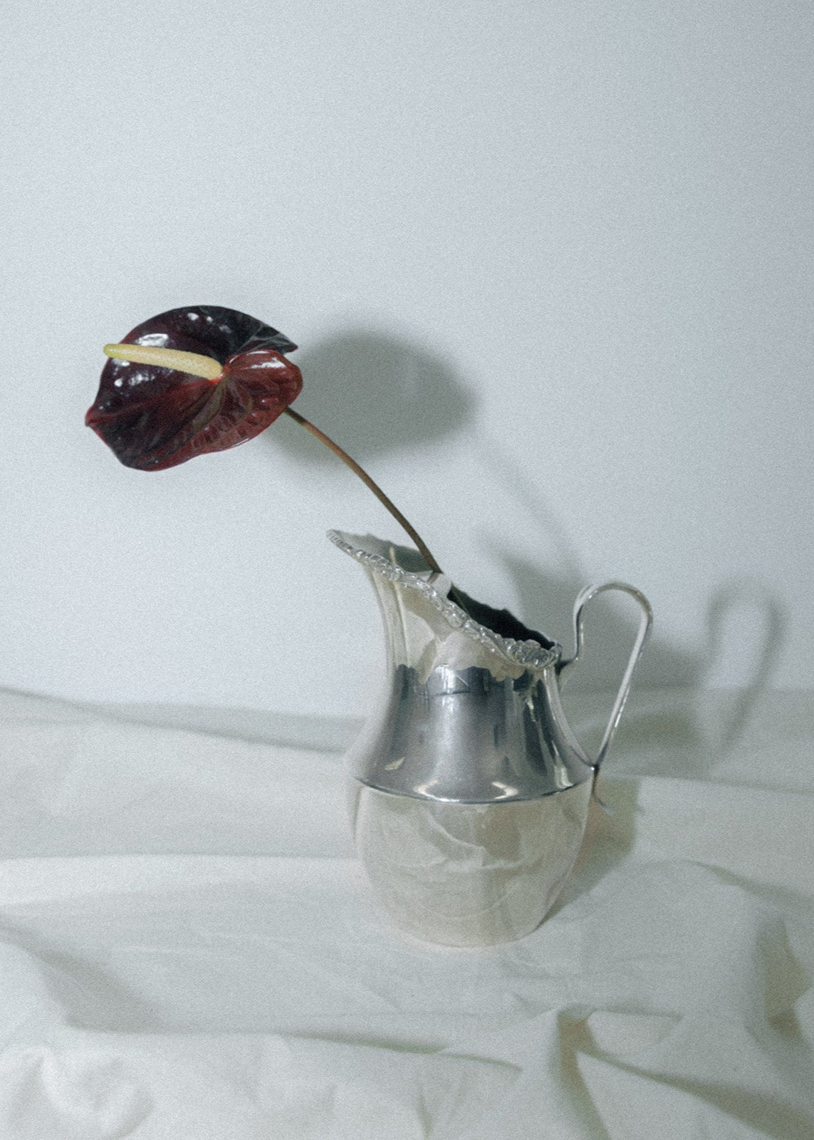 A curated trio of polished silver jugs, each with unique silhouettes and ornate handles. Perfect for serving, florals, or elevated styling. 3 available.